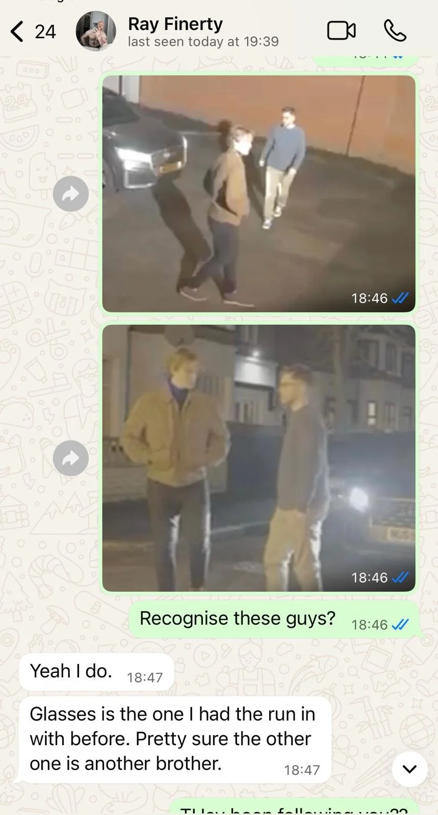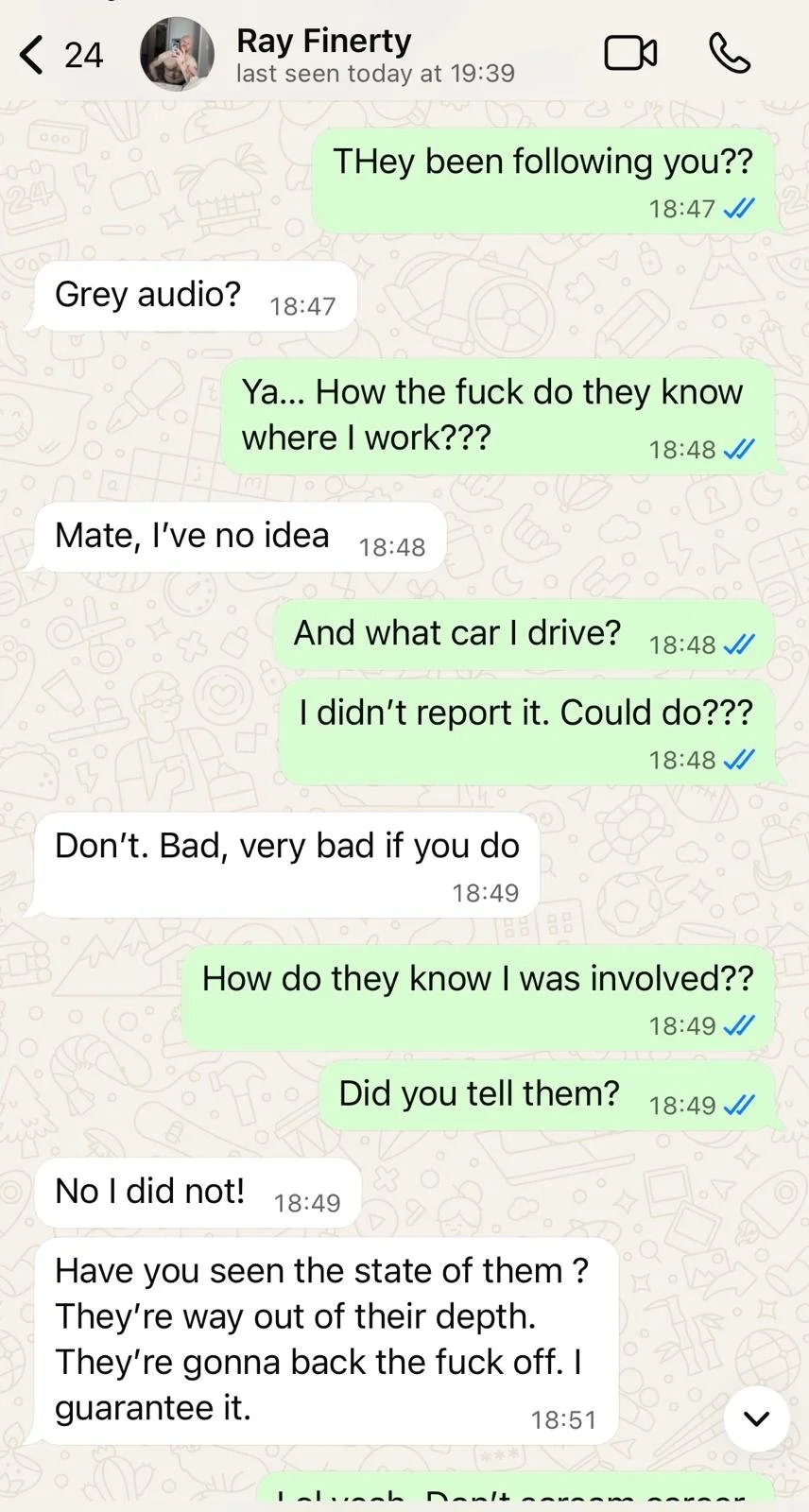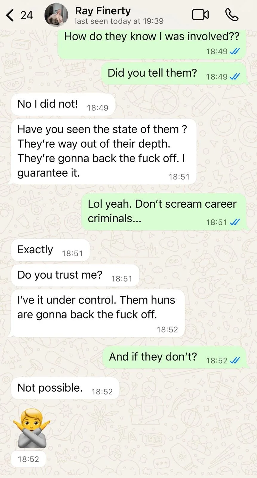 Mark’s lawyers have shared some materials with me. I don’t know if they are acting in good faith or if they are trying to influence my reporting / approach in interviewing their client. Amongst the materials are these screenshots from Mark’s phone: a WhatsApp conversation between him and Mr Finerty that took place after Felicity McKenna’s brothers followed Mark to his place of work. Mark’s lawyers believe this conversation, and other evidence, shows that he was the victim of a more domineering Finerty. They claim they show Mark had neither any knowledge of the McKenna brothers’ existence prior to meeting Finerty, nor that he harboured any ill sentiment towards them. They claim the fact that Mark didn’t respond to Finerty’s question ‘do you trust me?’ (18.51) shows that he both didn’t and that he was too afraid to say so. Part of their defence is to shift responsibility towards Finerty. But if Finerty is guilty of a crime, why isn’t he on trial?