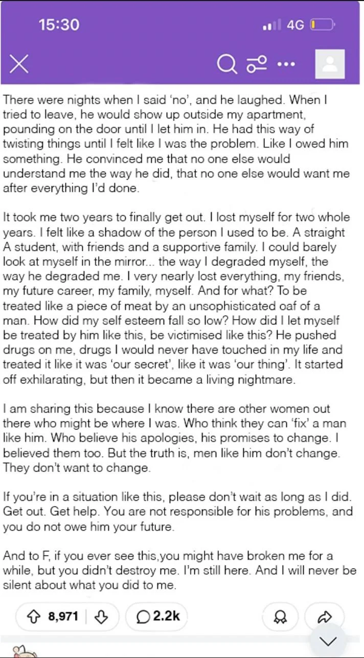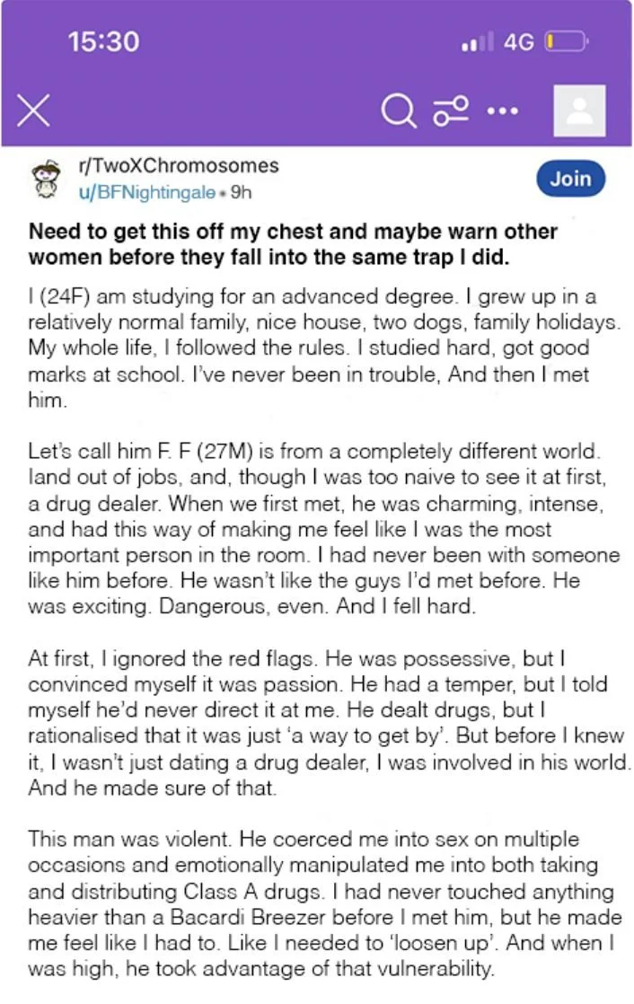 I have been sent screenshots of what I believe to be the original public Reddit post made by Ray Finerty’s ex-girlfriend in complaint of his behaviour. Ray makes reference to it in his conversation with Mark (see prior post ‘Demesne Audio’). The post was made to the popular forum ‘Two X Chromosomes’ (r/TwoXChromosomes on Reddit). This is a subreddit that focuses on women’s experiences, often from a feminist perspective.